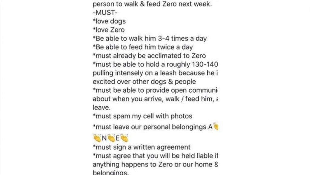 She also wanted to make sure all of the requirements would be met, including the pet dog sitter be “held liable if anything happened to Zero or our home and belongings, by demanding the dog sitter “sign a written agreement”.