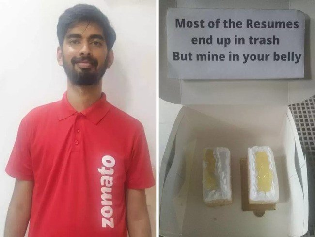 According to the post on economictimes.indiatimes.com captioned’’ Bengaluru man dresses as Zomato agent to deliver his résumé in pastry boxes to start-ups, receives job offers on LinkedIn, and on ndtv.com captioned: ‘’ Bengaluru Man, Wearing Zomato T-Shirt, Delivers Resume In Pastry Box’’, , Aman Khandelwal, delivered his resume in a box of pineapple pastries to a couple of start-ups in Bengaluru dressed as a Zomato executive because he felt most resumes end up in the trash.