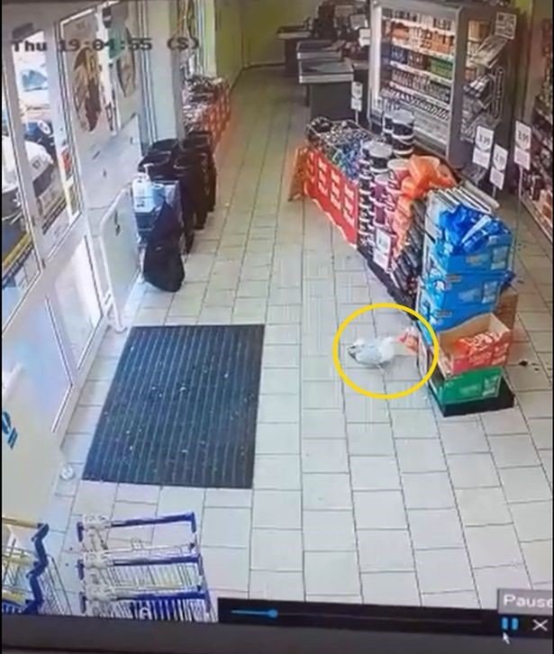 CCTV from Heron Foods captured the bold bird on the prowl but not for worms, as he would rather have some crisps, of which the greedy gull managed to pick up quite the bargain.