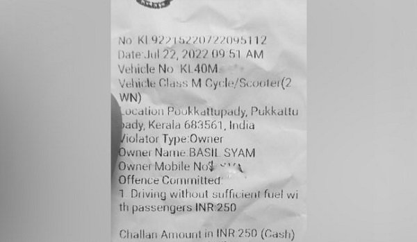 According to the report, the man in Kerala, India received a challan which said that he was riding his motorcycle without sufficient fuel with passengers. The image of the e-challan sent by Kerala Traffic Police was posted by the man on his Facebook page and is now circulating online and gaining traction.