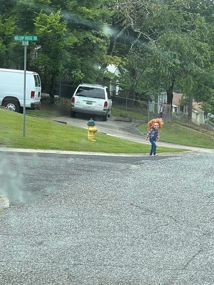 Kendra Walden spotted the scary figure resembling the evil protagonist from the 1980s “Child’s Play” horror movies and posted alarming pictures on Facebook. The diminutive look-alike prowled the neighborhood in overalls and a striped shirt, with long red hair very much like the movie villain.