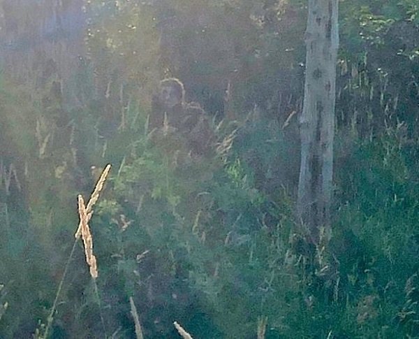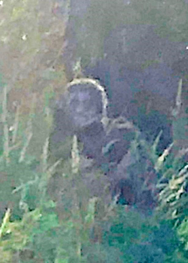 Two images – one of them zoomed in – were posted to Twitter. They show what appears to be a weird figure crouched behind some shrubs with its head and left shoulder visible.