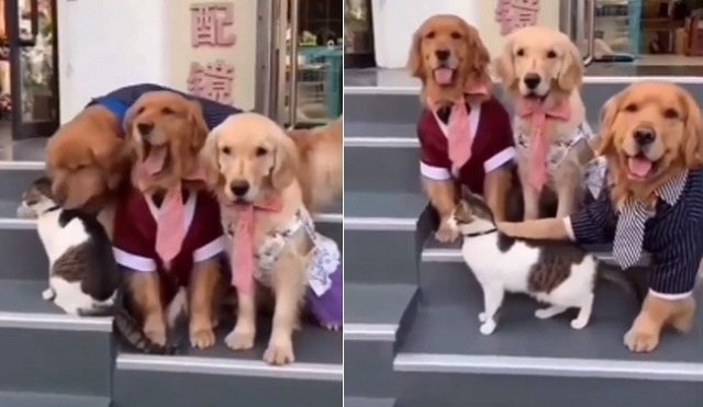 In another funny but interesting viral animal video, three pet dogs and a cat are getting ready for a family photograph, but the kitten keeps looking away from the camera forcing one of the pet dogs to drag the stubborn cat to pose for the family photo.