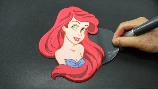 Tiger Tomato starts the artistic process by choosing a design – mostly inspired by popular cartoons and pop icons – then proceed to use a needlepoint batter container to draw the outline of the design, before using coloured batter to fill out certain parts and finally filling out the entire “drawing” with background batter. Then they cook the pancake and when it’s flipped, an intricate edible spongy masterpiece is revealed.